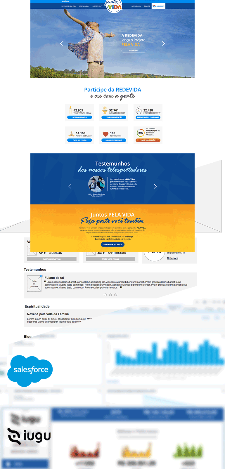 Para viabilizar o projeto Juntos Pela Vida, da Rede Vida, foram desenvolvidas diversas iniciativas iniciando pelo site do projeto. Nele são apresentadas as principais ações sociais realizadas pelo INBRAC, instituto responsável pela manutenção do canal de televisão. Pelo site é possível interagir com a programação, registrando seus votos para entes querido através de pedidos de missas, velas e mensagens aos padres e apresentadores. Também é possível fazer um cadastro e se tornar um Benfeitor Pela Vida com doações mensais ou pontuais via boleto bancário ou cartão de crédito. Todas as ações são mapeadas em réguas de relacionamento integradas ao CRM Sales Force e as doações processadas utilizando o iugu. Para a equipe administrativa e call center também foi criada uma interface especial para que os pedidos de doação feitos por telefone sejam registrados.